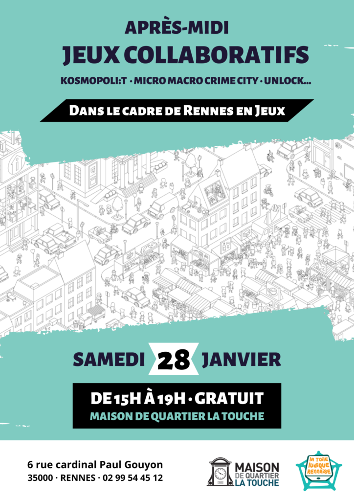 Le samedi 28 janvier après-midi jeux collaboratif dans le cadre de Rennes en jeux. De 15h à 19h à la Maison de Quartier La Touche Gratuit
