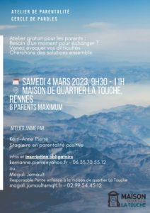 Le samedi 4 Mars 2023 de 9h30 à 11h à la Maison de Quartier La Touche.