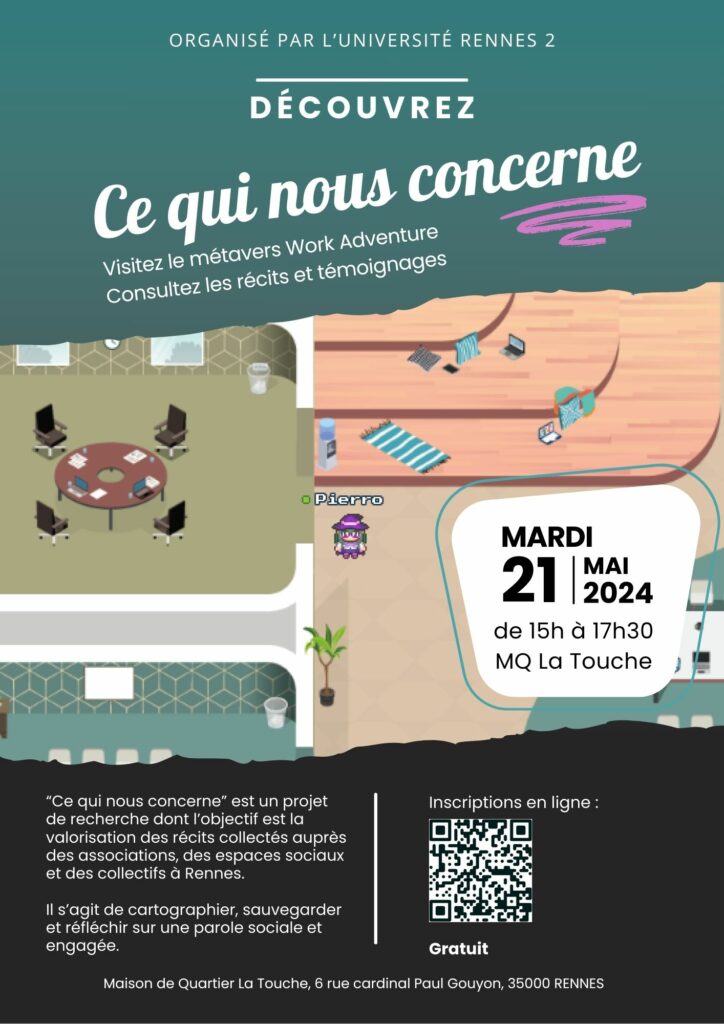Animé par Pierro et par l’équipe de recherche, cet atelier vous fera découvrir le métavers Work Adventure, afin d’y consulter les récits et témoignages collectés auprès d’associations, d’espaces sociaux et de collectifs de Rennes.
