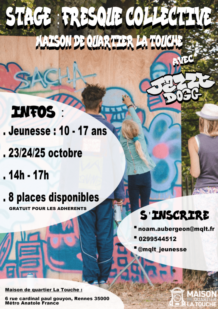 Tu as entre 10 et 17 ans et tu souhaites participer à la réalisation d’une fresque collective ? Rejoins-nous les 23, 24 et 25 octobre, de 14h à 17h ! Le stage sera réalisé avec la présence de Jazzy Dogg, et c’est gratuit si tu es adhérent ! Inscris-toi par mail, à noam@mqlt.fr, ou par téléphone au 02 99 54 45 12. Ne tarde pas, il n’y a que 8 places