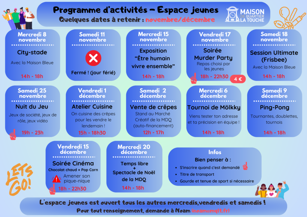 Tous Programmation jeunesse – Novembre / Décembre Découvrez la programmation pour les 10 – 17 ans, jusqu'aux vacances de Noël !stecy24 octobre 2023
