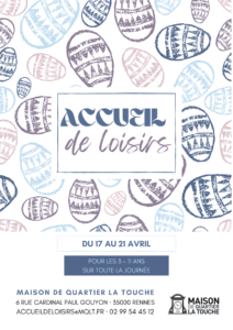 L‘accueil de loisirs pour les vacances d’avril sera ouvert du lundi 17 avril au vendredi 21 avril. Si vous souhaitez inscrire votre/vos enfant(s), merci de compléter ce formulaire