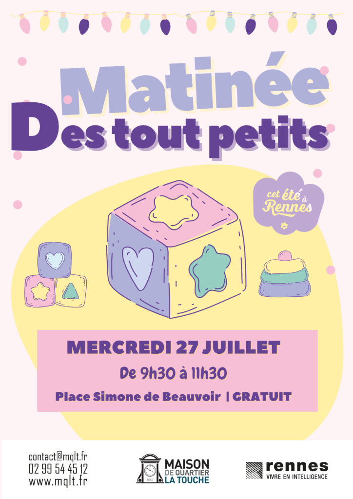 La Maison de Quartier La Touche organise un temps fort pour les tout petits : un espace jeu pour les 0 – 3 ans sur la place Simone de Beauvoir, avec les structures et les jouets adorés des bébés. Cet événement intègre la programmation de Cet été à Rennes . Il est gratuit et ouvert à toutes et à tous.