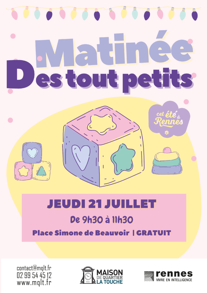 La Maison de Quartier La Touche organise un temps fort pour les tout petits : un espace jeu pour les 0 – 3 ans sur la place Simone de Beauvoir, avec les structures et les jouets adorés des bébés. Cet événement intègre la programmation de Cet été à Rennes . Il est gratuit et ouvert à toutes et à tous.