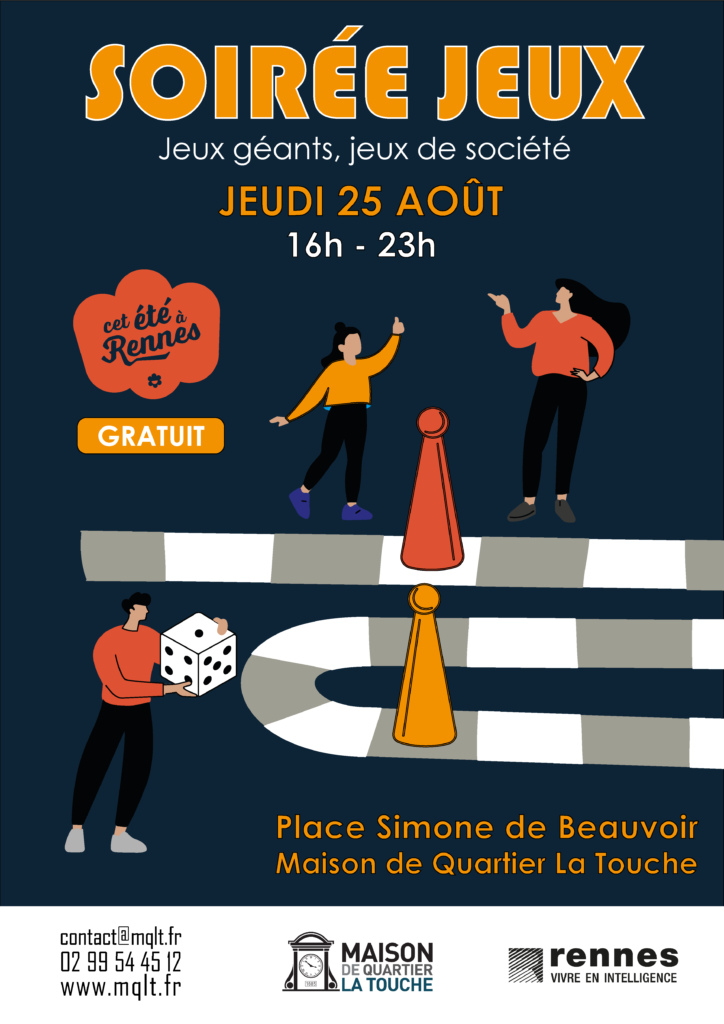 La Maison de Quartier La Touche organise un temps fort autour du jeu : Des jeux géants à l’extérieur pour profiter de la soirée estivale et une soirée jeux de société à l’intérieur de la Maison de Quartier : c’est le programme d’une bonne soirée ludique. Cet événement intègre la programmation de Cet été à Rennes . Il est gratuit et ouvert à toutes et à tous.