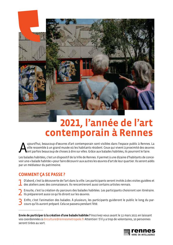 Si vous êtes intéressés, vous pouvez vous inscrire en envoyant vos coordonnées à dirculture@rennesmetropole.fr jusqu’au 12 mars 2021. Vous et les autres guides-habitants disposeront alors de trois mois pour concevoir votre parcours (avril, mai, juin 2021). Vous l’animerez à l’été 2021 (juillet, août). Le nombre de balades sera fixé par les guides-habitants vous-mêmes, en fonction de vos envies.