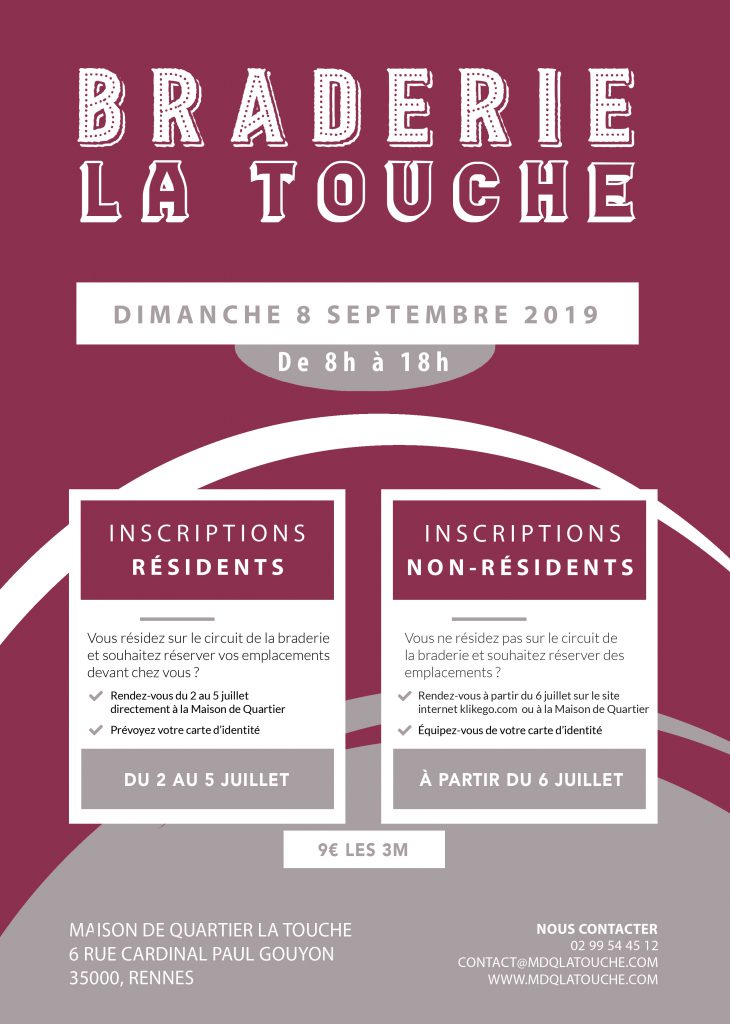 Pour les résidents du circuit de la braderie qui souhaitent réserver un emplacement devant chez eux, rendez-vous du 2 au 5 juillet, aux horaires d’ouverture de la Maison de Quartier La Touche, avec une pièce d’identité !