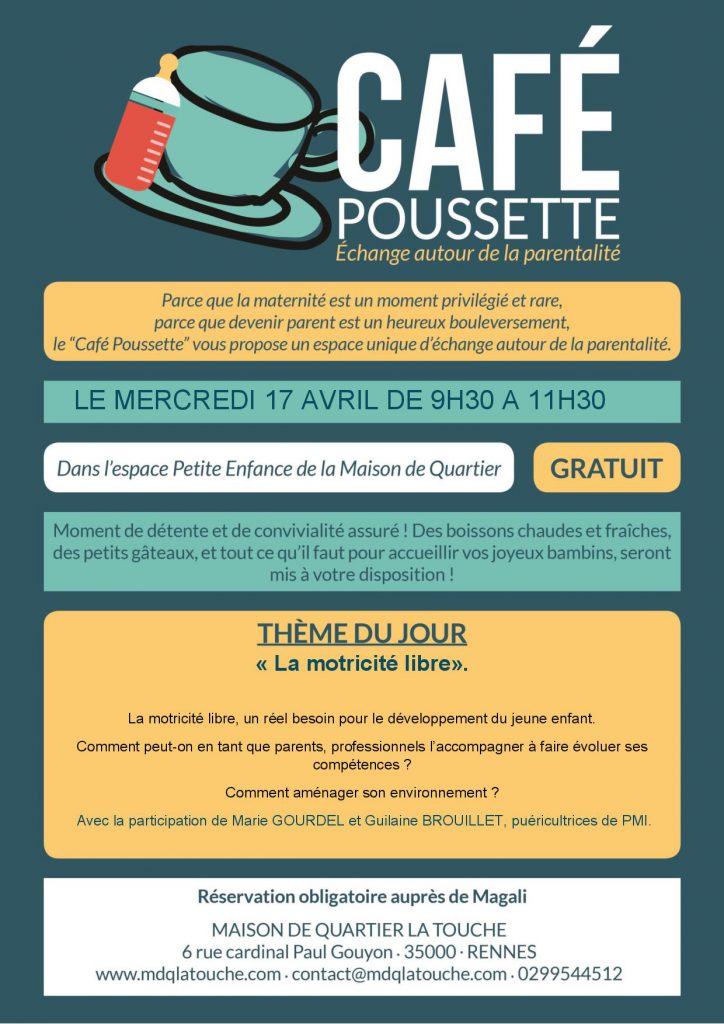 Magali vous donne rendez-vous pour un nouveau Café Poussette, le mercredi 17 avril de 9h30 à 11h30 ! En compagnie de Marie Gourdel et Guilaine Brouillet, puéricultrices de PMI, elles vous proposent une séance sur le thème de la motricité libre. Est-elle un réel besoin pour le développement du jeune enfant ? Comment peut-on, en tant que parents, professionnels, l’accompagner à faire évoluer ses compétences ? Comment aménager son environnement ?