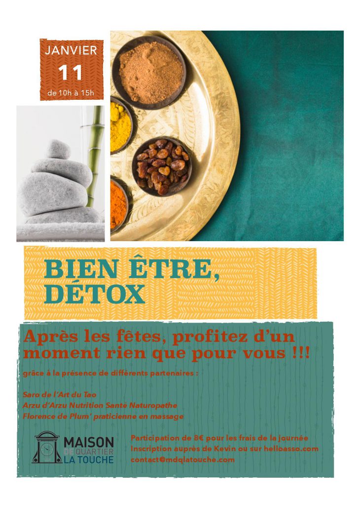 Après les fêtes, profitez d’un moment rien que pour vous !Cette journée détente est sur inscription, via ce lien : https://www.helloasso.com/associations/maison-de-quartier-la-touche/evenements/journee-detox-bien-etre