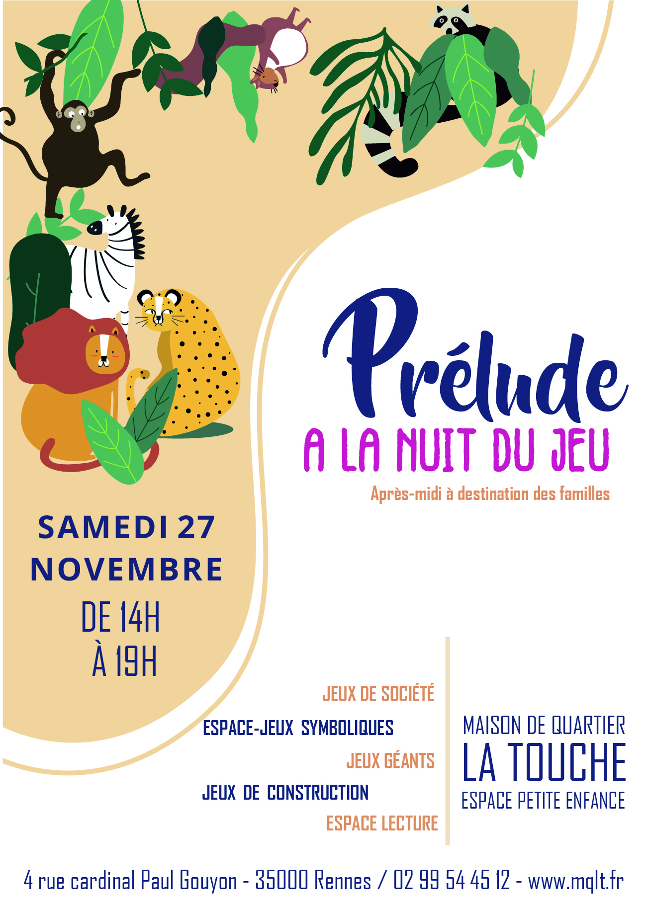 Le samedi 27 novembre, de 14h à 19h, retrouvez l’événement Prélude, à destination des familles ! Au programme : jeux de société, espace-jeux symboliques, jeux géants, jeux de construction, espace lecture. Tout l’après-midi est gratuit et ouvert à tous !