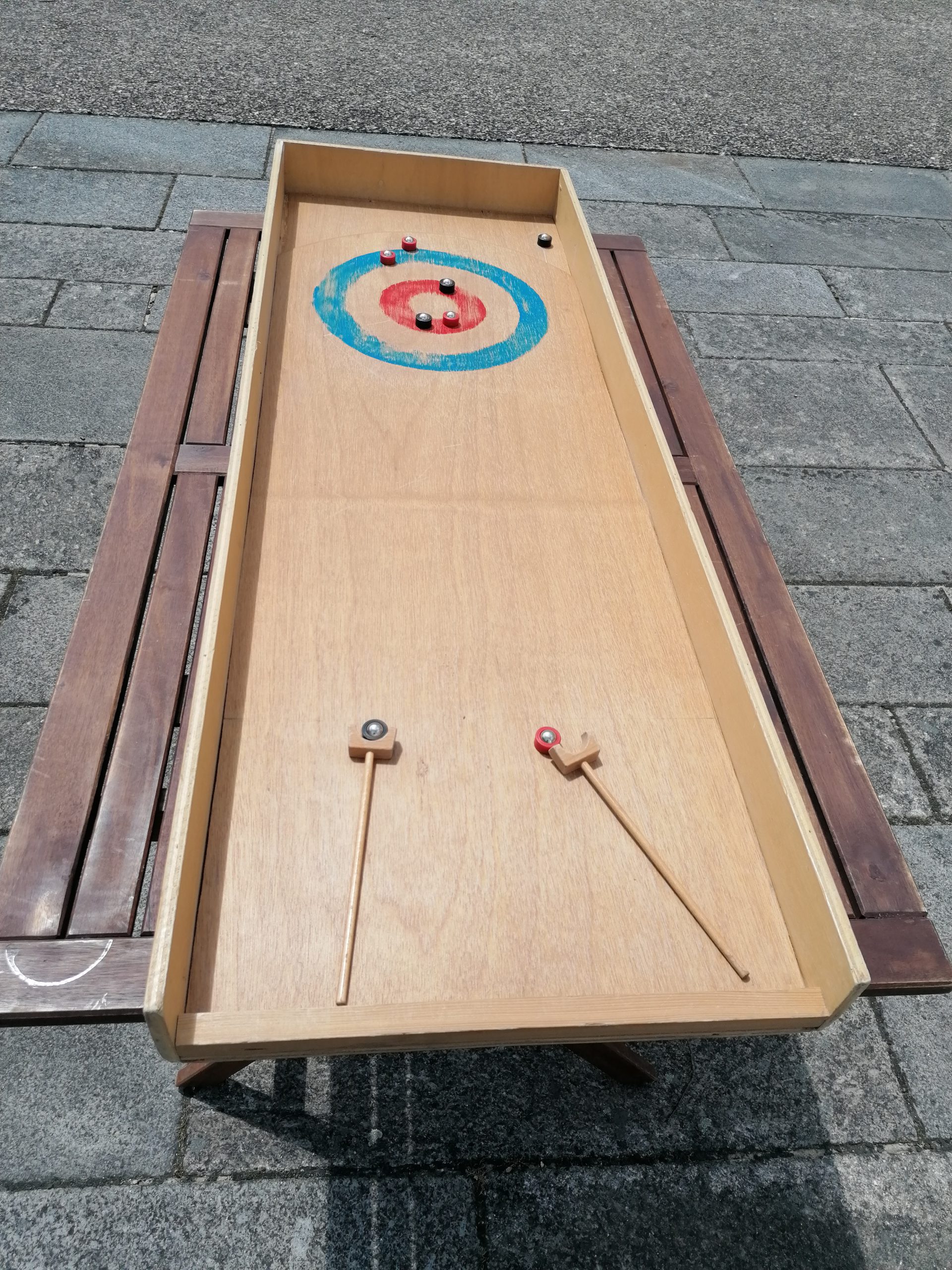 A l’aide du lanceur, poussez les curlings le plus près de la cible sans dépasser la zone de pénalité.