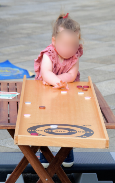 Une grande piste de jeu sur laquelle une cible est l’objet de toutes les approches. Glissez les palets pour obtenir le plus de points selon les cercles de la cible.