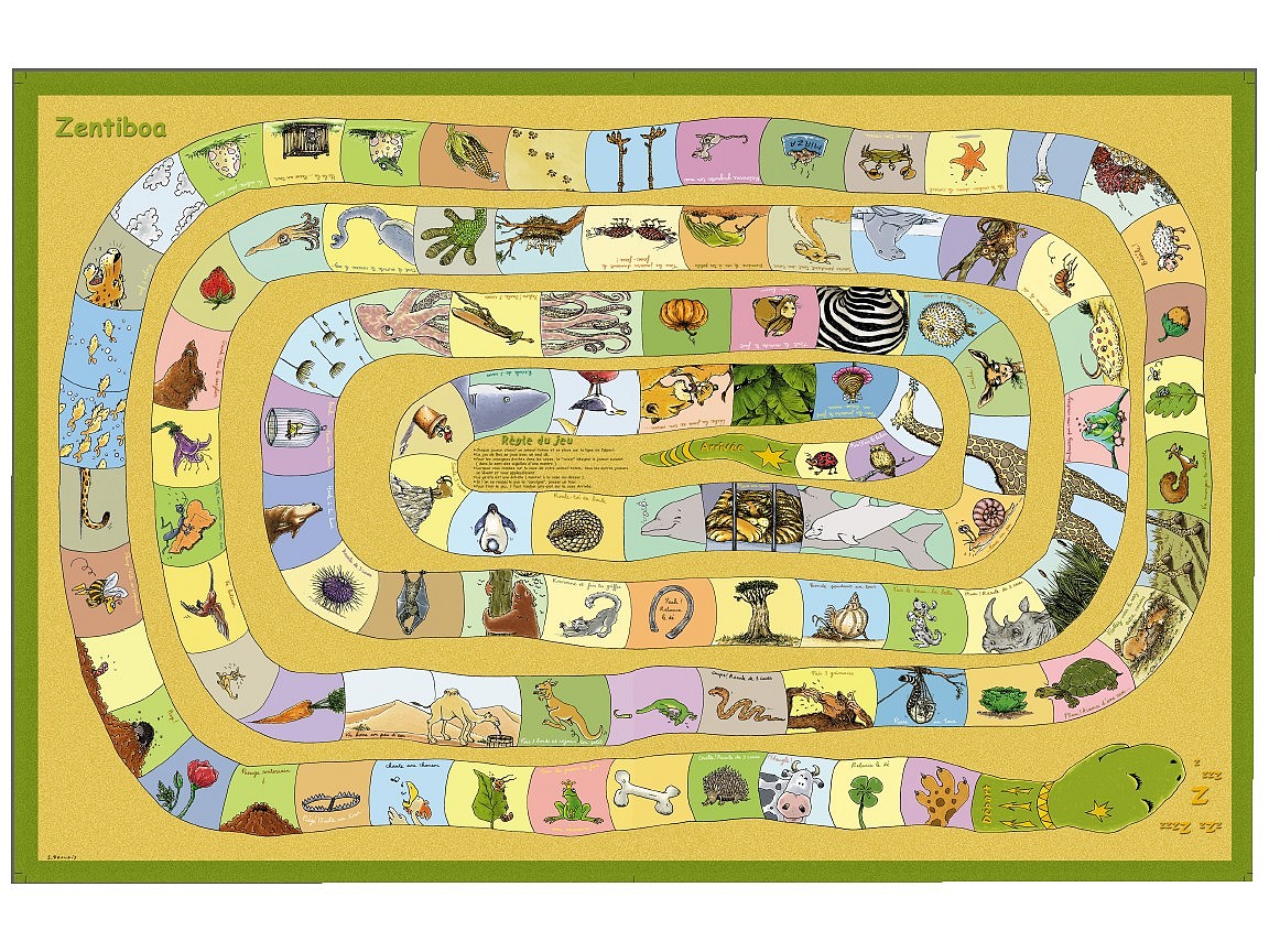 Jeu de l’oie géant. Le parcours en forme de boa, réserve de nombreuses surprises aux enfants qui doivent déplacer leurs animaux totems de case en case en respectant les consignes classiques et en réalisant aussi des gages plus insolites.