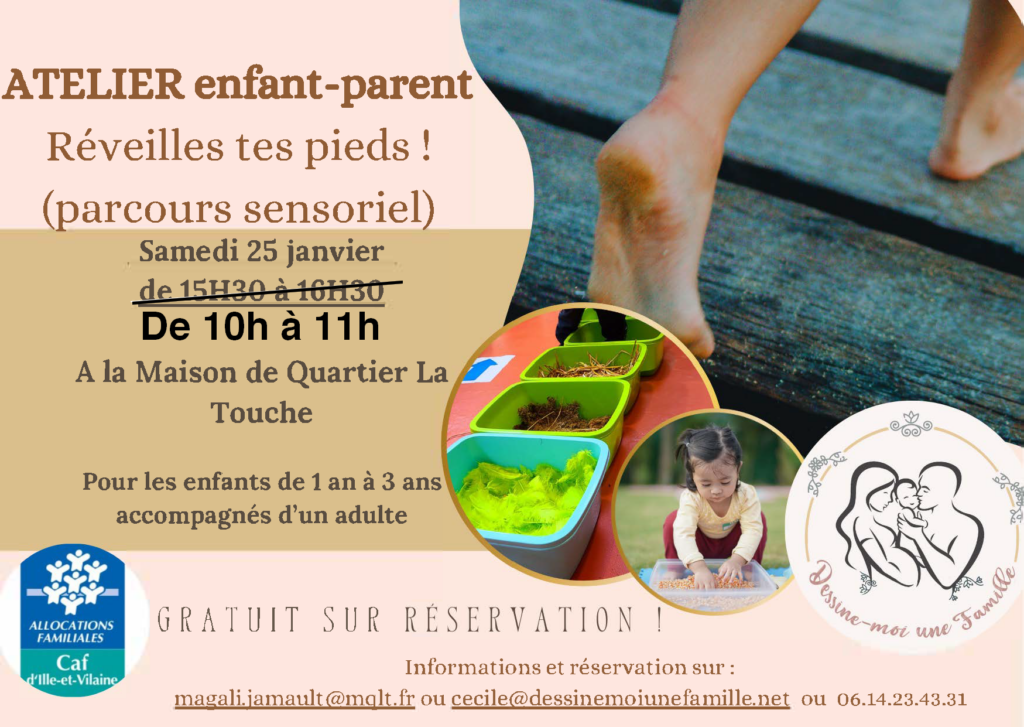 Atelier parent – enfant Un parcours sensoriel pour les plus petit·es, de 1 à 3 ans, accompagné·es d’un·e adulte. Le samedi 25 janvier, de 10h à 11h Gratuit, sur réservation à cecile@dessinemoiunefamille.net ou au 06 14 23 43 31