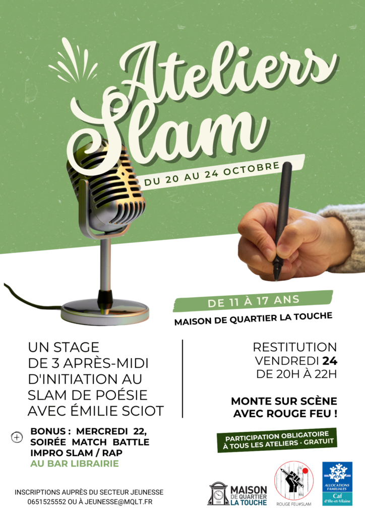 Les ateliers slam se termineront par une restitution au grand public le vendredi 24 octobre, de 20h à 22h.
