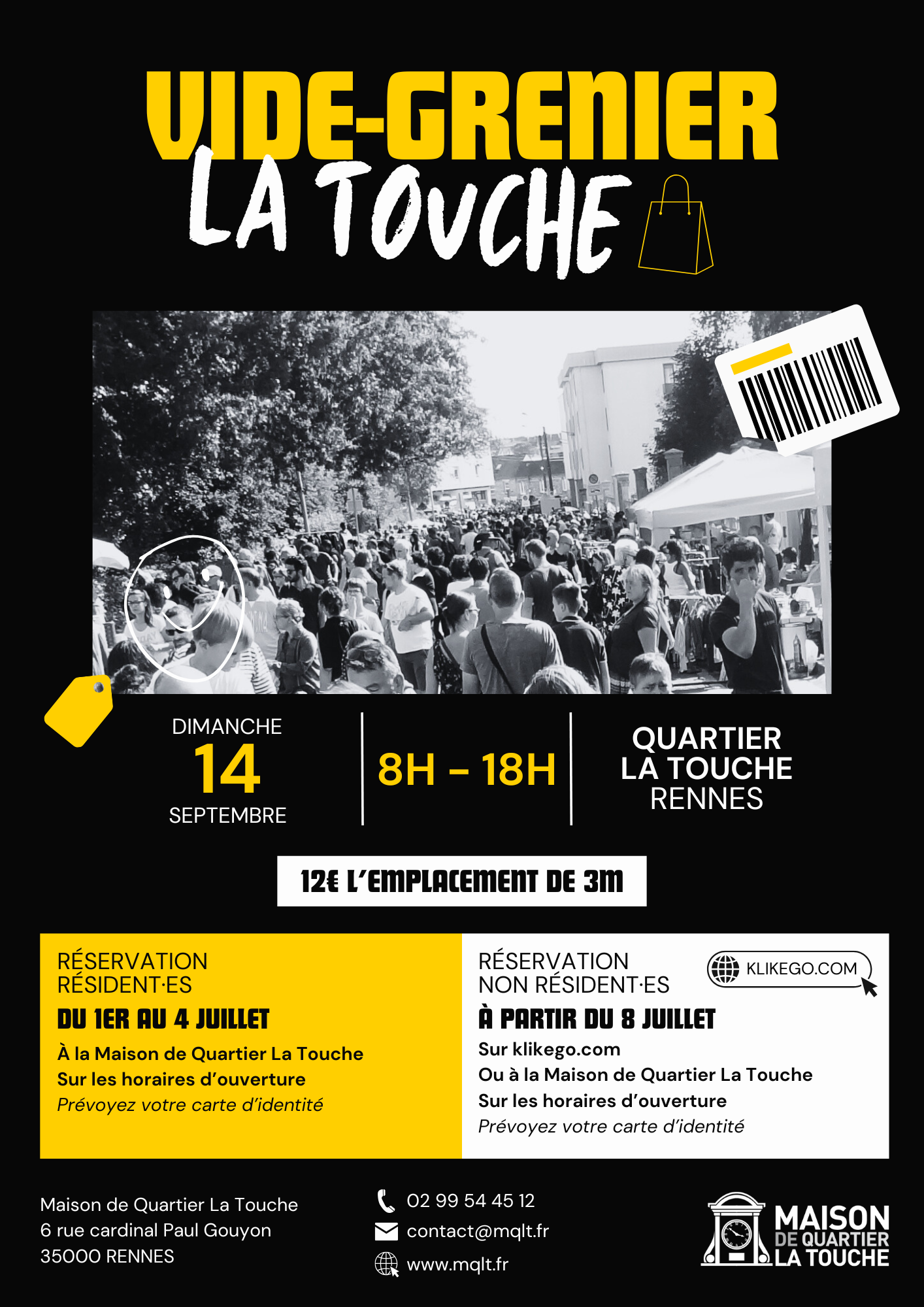 Le vide-grenier La Touche est une grande journée de rencontres, de convivialité… et de bonnes affaires bien sûr. Environ 1000 emplacements, des stands de rafraichissement et de restauration, et une météo toujours au top !